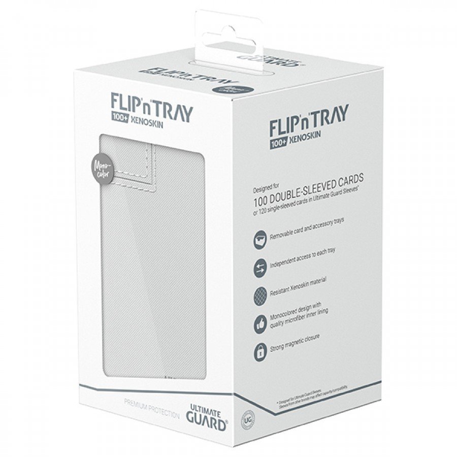The quintessential Ultimate Guard deck box: a timeless design with strong magnetic closure, card and dice trays for safe storage of your deck, and a resistant but smooth Xenoskin surface. Looking for additional safety? Exchange the card tray with one of our Ultimate Guard Boulder 100+’s. With room for 100 double-sleeved or 120 single-sleeved cards in standard size, the Flip’n’Tray 100+ has it all.