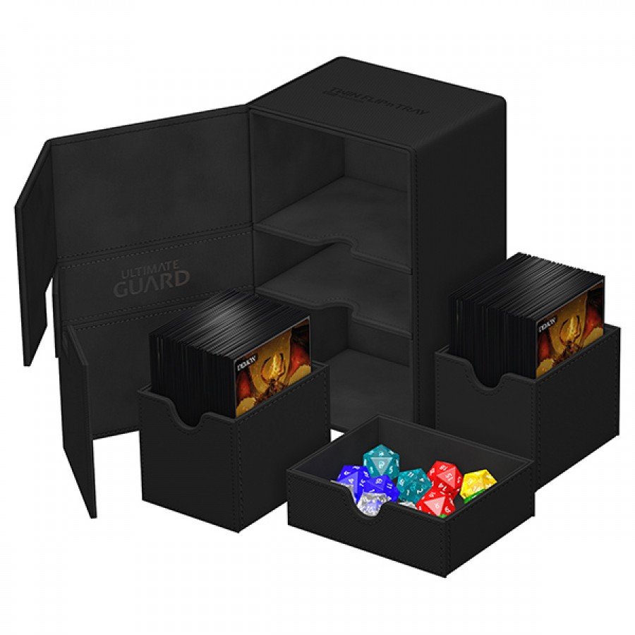 One box, two card decks, and additional accessory tray: Our Twin Flip’n’Tray 160+ offers all the features a great deck box needs. Doubling the size of our classic Flip’n’Tray 80+, this box is the bigger sibling everyone is looking for. The Twin Flip’n’Tray 160+ can hold 160 doublesleeved or 200 single-sleeved standard sized cards*.